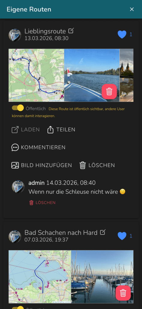 Ein neues Feature erwartet alle User der Boatrouting-App und Webseite. Im Seitenmenü unter „Meine Routen“ könnt ihr eurem Törn eine persönliche Note geben, indem ihr Bilder von eurer Reise hinzufügt. Auf Wunsch könnt ihr die Route auch veröffentlichen, sodass andere User sie sehen, liken und kommentieren können.